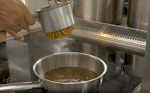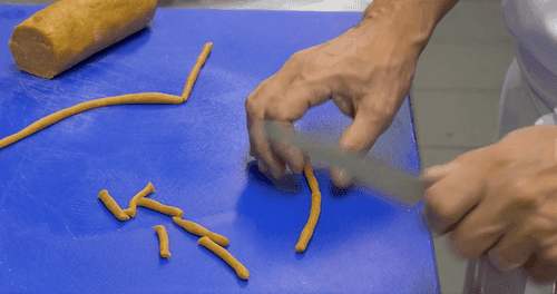Place the chilled dough sausage into a potato masher with large holes. Ideally, the hole diameter should be 2 mm. In Italy, there is a special aluminum press for making passatelli called ferro. If you don't have the right gadgets, roll thin sausages by hand using your palms.