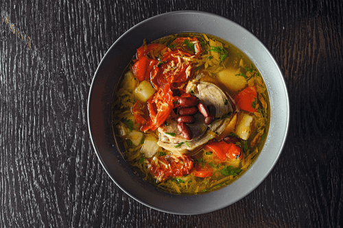 Pour the soup into a bowl, add pieces of pork knuckle, sun-dried tomatoes, and red beans. Sprinkle with chopped parsley.