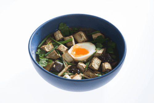 Pour the soup into bowls, add eggplant, sliced green onions, and remaining ginger cut into thin strips. Top with half an egg, sprinkle with chopped cilantro and any herbs to taste, and garnish with fried onions.