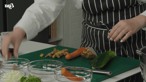 Prepare the broth. Peel the ginger (leave a little for garnishing the soup) and cut it randomly. Also peel the celery and carrot, but do not cut them. If you will not boil the broth for long but still want a rich flavor, you can roast the vegetables in the oven.