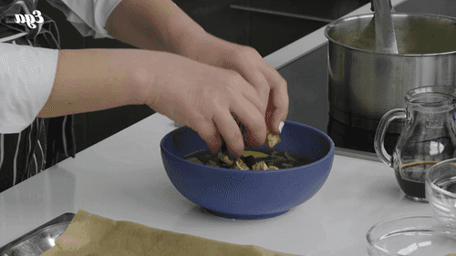 Prepare the eggplants. Cut them into 1 cm slices, place on a baking sheet, salt them, and drizzle with vegetable oil. Optionally, you can add a clove of garlic pressed through a garlic press to the eggplants. Send the eggplants to a preheated oven at 180 degrees on convection mode for 15 minutes.