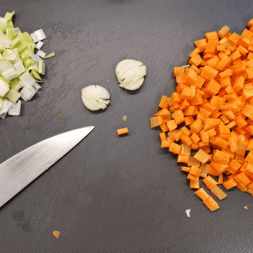 Cut the carrot into small cubes. Crush the garlic with a chef's knife and finely chop the leek.