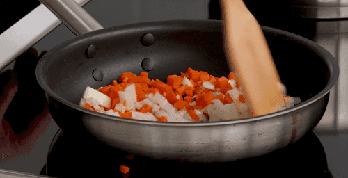 Heat vegetable oil in a pan and fry the onion and carrot until golden.