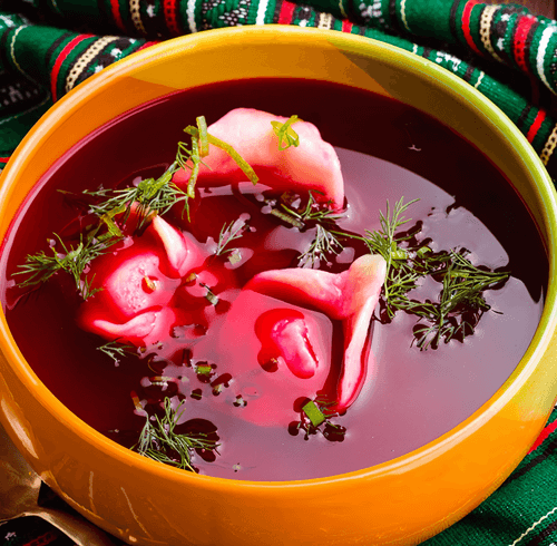 Borscht with 'ears' is an exquisite version of classic Russian borscht, embodying the warmth of traditions and richness of flavor. The history of this dish dates back centuries when housewives sought to add more heartiness and texture to borscht by inventing elegant 'ears' – small dumplings filled with fragrant mushroom and chicken filling. The beet broth, enriched with spices and a hint of lemon's acidity, acquires a rich color and deep taste. Tender 'ears' soaked in broth lend the dish a special refinement, while herbs add freshness. Borscht with 'ears' is perfect for cozy home lunches and festive gatherings, surprising with its combination of simplicity and gastronomic sophistication.