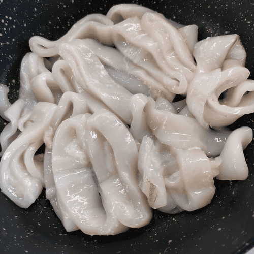 Cut the squid into rings about 2 cm wide, grease with oil, and place on a hot skillet. Add salt.