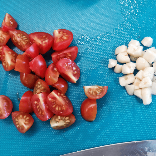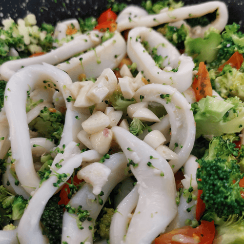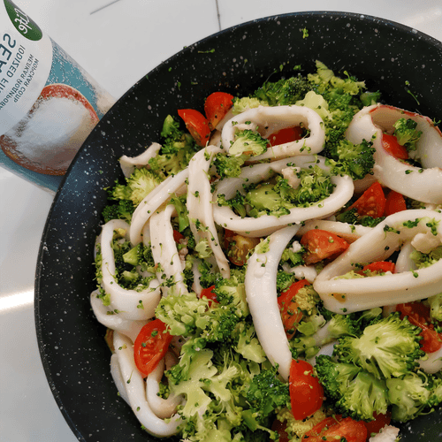 Stir the squid after 2-3 minutes. Reduce the heat. Add broccoli and cherry, season with salt. Stir.