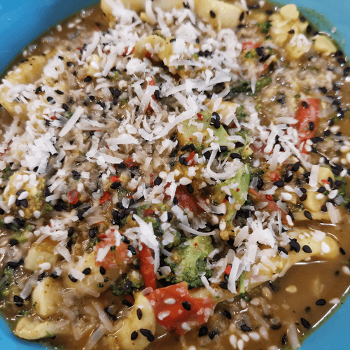 Stir. Cook for a couple more minutes, remove from heat and add parmesan and sesame. To adjust the consistency, you can add a little hot water.