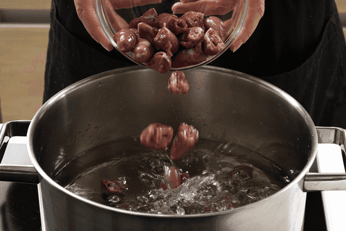 When foam appears, remove it, reduce the heat, and boil the meat for 1 hour. The hearts should be soft like boiled beef.