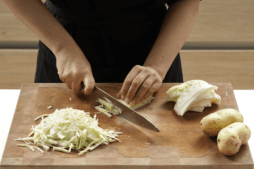 Chop the cabbage and dice the potatoes.