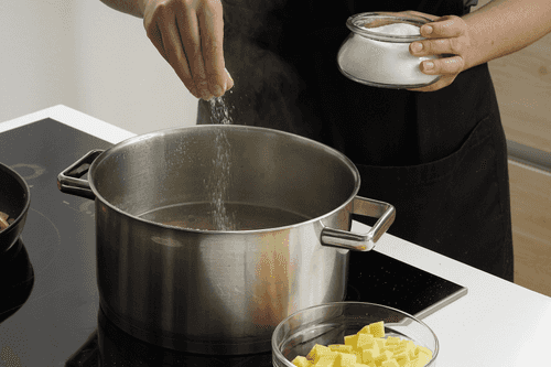 When the hearts are cooked, salt the broth and add potatoes.