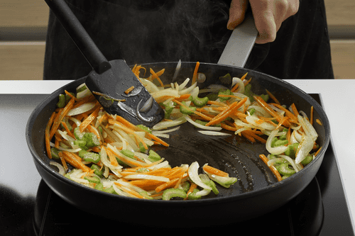 Cut the carrot, onion, and celery into strips and sauté in vegetable oil until soft.