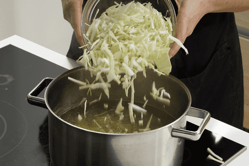 When the broth boils again, add the cabbage, stir, and let the broth come to a boil again.