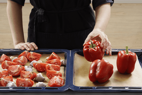 Place the peppers on one baking sheet and the tomatoes, onions, and garlic on another.