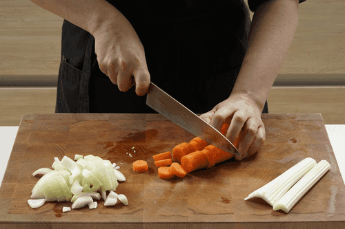Prepare vegetable broth. Peel the onion and carrot. Cut the celery, carrot, and onion into small pieces and place them in a wide pot.