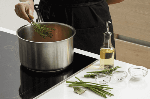 Add dill and parsley stems, salt, pepper, and bay leaf. Pour water and vinegar into the pot.