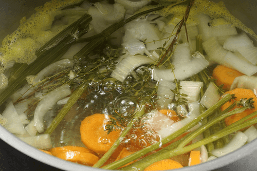Strain the broth through a sieve. Pour out 600 ml of broth, and cool and freeze the remaining broth for future use.