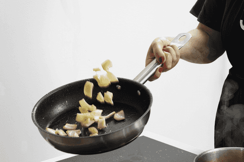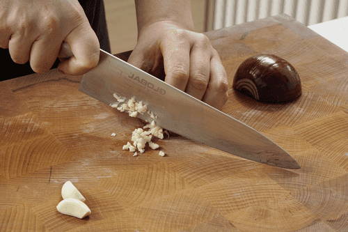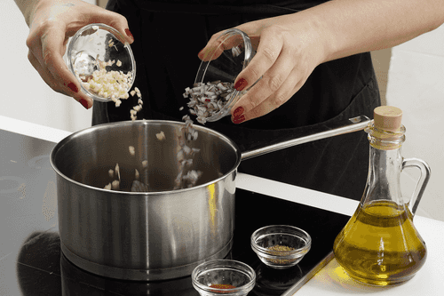 Clean and finely chop the red onion and garlic.