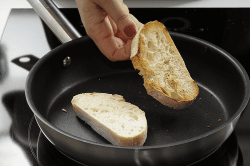 Dry the bread slices in a toaster or fry them in a dry pan until golden brown.