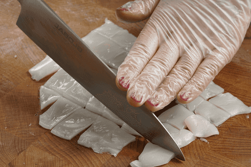 Cut the squid into rings of 1.5 cm or small 'cubes'.