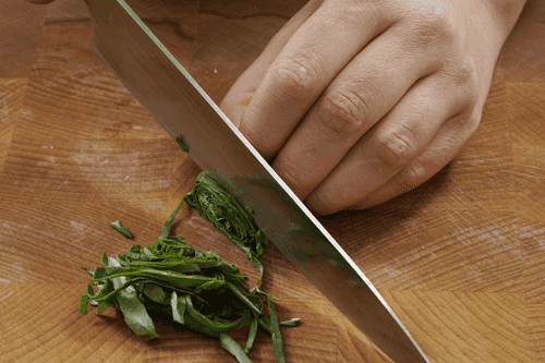 Remove from heat, add chopped basil greens, and salt.