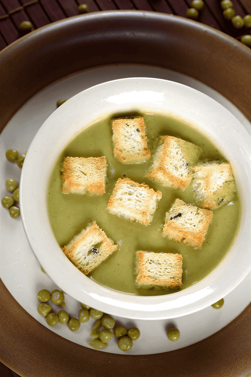 Fry the flour with part of the butter, dilute with broth, combine with mashed peas and bring to a boil, then strain and season with cream mixed with egg yolk and butter.