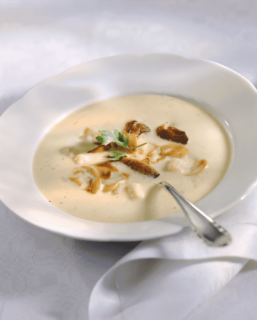 Before serving the soup, mix cream with mashed egg yolk and butter. To prevent the yolks from curdling, the soup temperature should be 75–80 degrees.