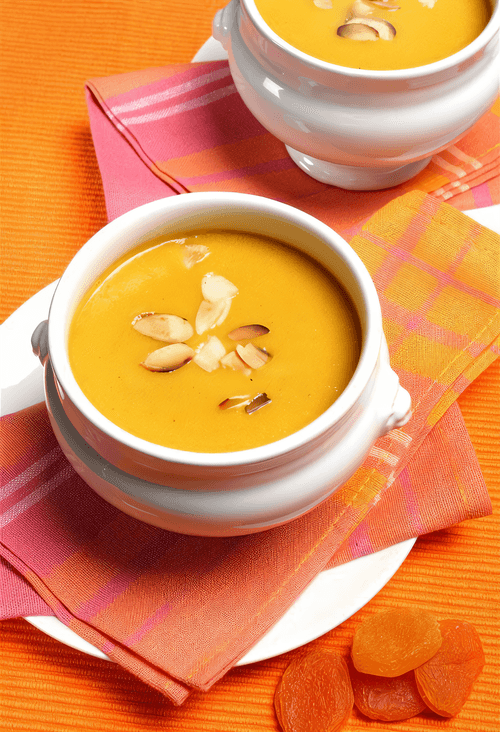 Before serving, add ice cubes to the soup. Serve with grapes (cut each grape in half) and apple slices.