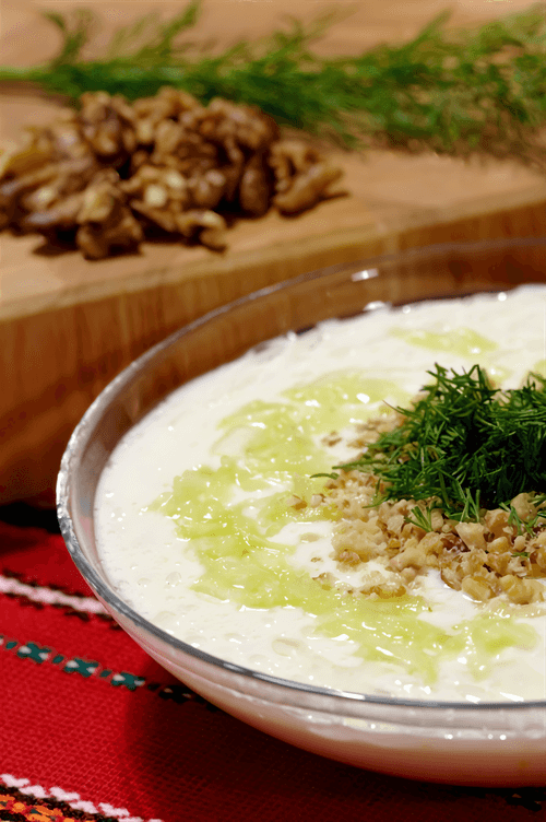 Tarator is a refreshing cold soup from traditional Bulgarian cuisine. Its history dates back to ancient times when Bulgarians used simple yet nutritious ingredients in their diet. This dish is characterized by the lightness and pleasant tang of yogurt, harmoniously complemented by the freshness of cucumbers and the aroma of garlic. Nuts add richness to the soup, while vinegar adds a tangy note. It is perfect for hot summer days, refreshing and quenching thirst. Tarator is often served chilled, and its delicate flavor makes it a great addition to meat and fish dishes or a light dinner on its own. The simplicity of preparation and availability of ingredients make it a favorite dish in Bulgarian families.