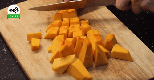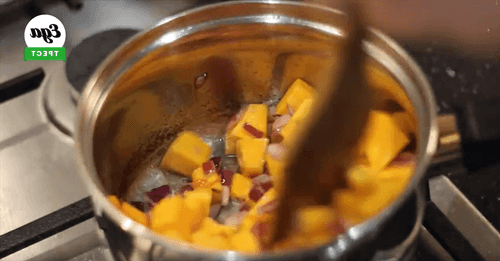 Next, add the diced pumpkin flesh to the saucepan and sauté it with the onion and garlic, making sure nothing burns and stirring constantly.