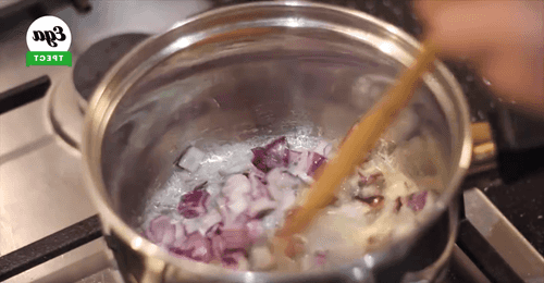 Finely chop red onion and garlic and sauté in a deep skillet with butter. First the onion, and when it becomes soft — the garlic. Garlic is sautéed only until a strong aroma appears — no longer. Overcooked garlic is bitter.