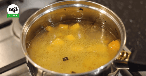 Once the pumpkin softens slightly, easily determined by pressing with a spoon, pour brandy into the pan and fry for another five minutes until the alcohol evaporates.