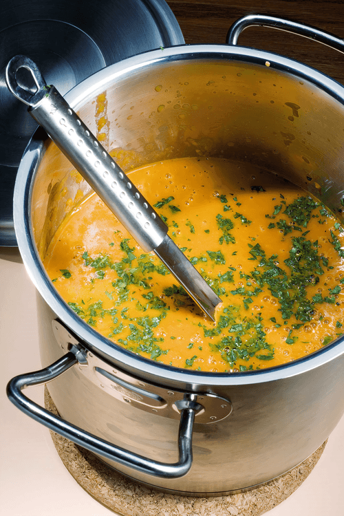 Send the contents of the pan to the blender, add low-fat cream, and at low speeds, or better yet — in pulse mode — turn the thick soup into a fragrant southern orange puree.