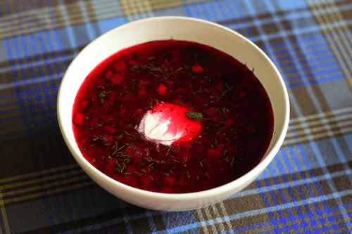 Pour sour cream mixed with boiled egg yolk into the bowl of beet soup.