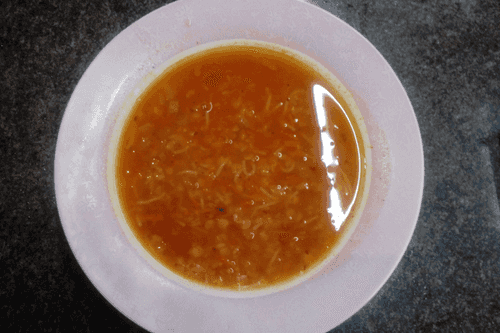Add thin vermicelli and raisins to the lentils, bring to a boil, remove the foam, add basil, pepper, 'Knorr' seasoning or a broth cube, and simmer for 7-10 minutes.