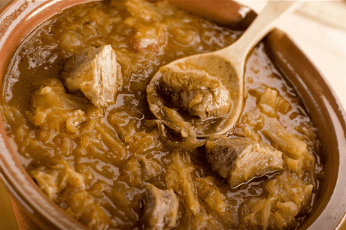 In a separate pot, sauté finely chopped onion and fat taken from the broth, add pieces of chicken removed from the broth, and simmer, stirring occasionally, for another 15 minutes.
