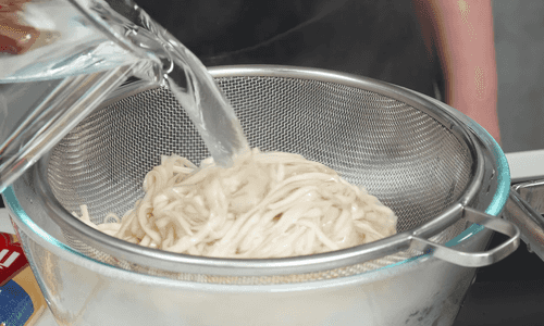 Then drain the noodles in a colander and rinse quickly. Set the noodles aside.
