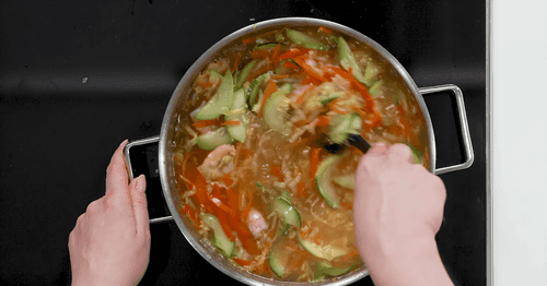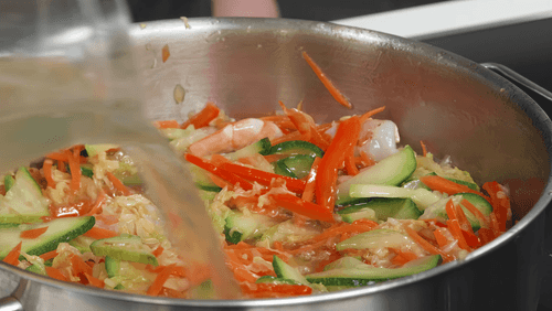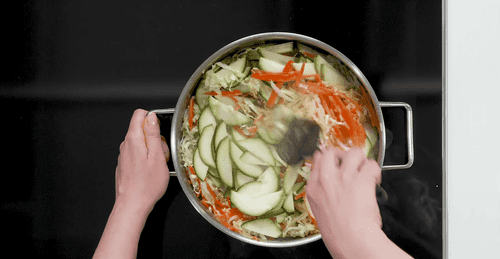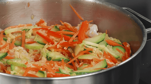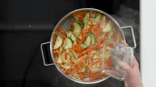 Heat vegetable oil in a pan over high heat. Add onion, carrot, bell pepper, zucchini, and Chinese cabbage to the pan.