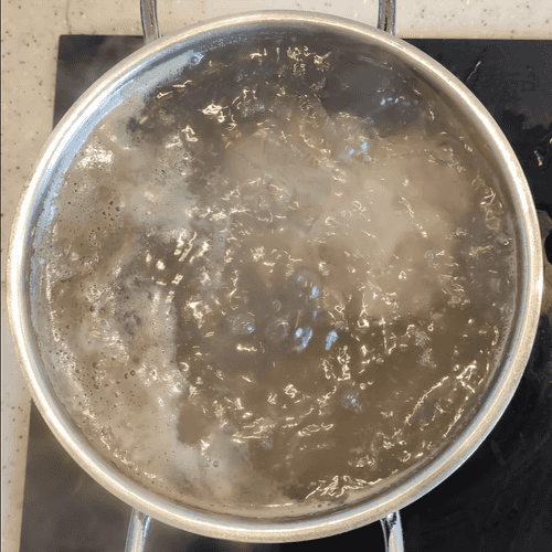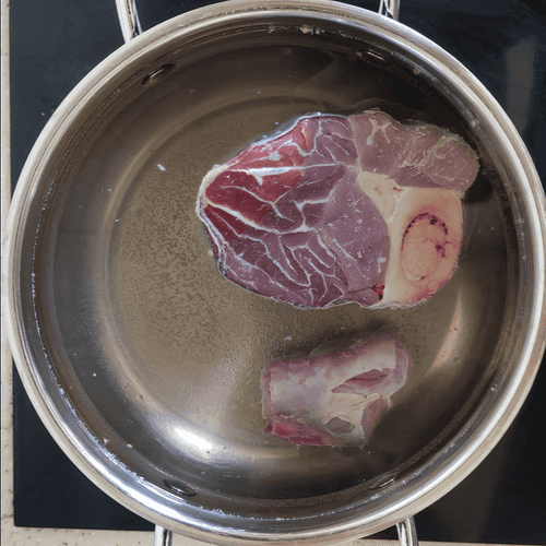 After 3 minutes of boiling, strain the broth, rinse the meat, and refill with water. Now boil the meat until cooked for 1 hour.