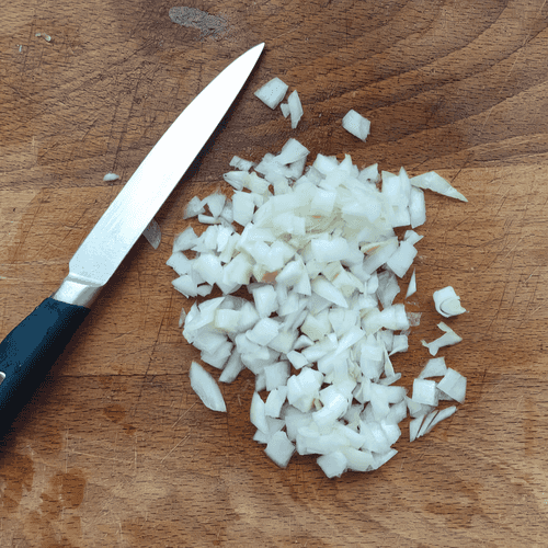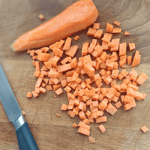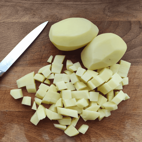 While the broth is boiling, peel the potatoes and cut them into small cubes.