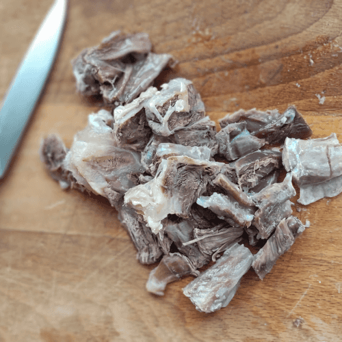 Remove the boiled meat from the broth, cool it down, and slice it into small pieces.