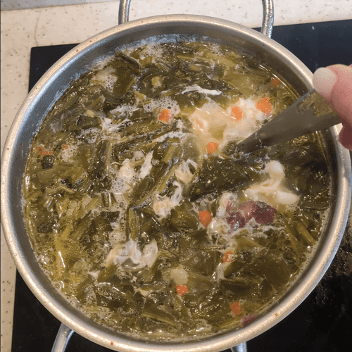 Mix immediately until homogeneous and turn off. Add pepper and salt to taste. Cover the soup and let it steep for 15-20 minutes.