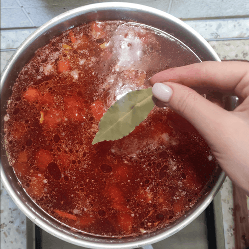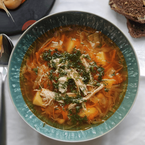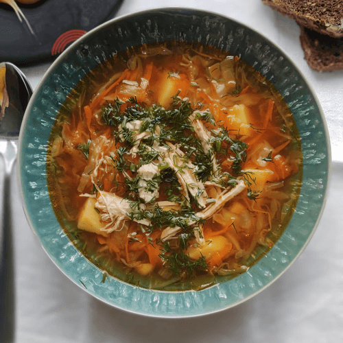 Borscht with tomatoes is a variation of classic Russian borscht that gains a special sweet-sour note from fresh tomatoes. The origins of borscht date back to ancient times when Slavic peoples began cooking soup from beets, gradually adding various ingredients. This borscht combines the rich meaty flavor of pork ribs, the aroma of spices, and the gentle acidity of tomatoes. It warms in the cold, nourishes, and delights with its vibrant color. It is traditionally served with fresh herbs and garlic, sometimes with a spoonful of thick sour cream. This borscht is perfect for family lunches when you want to treat your loved ones to something traditional yet new. Its rich flavor with a hint of tomato acidity makes it special among many variations of this beloved dish.