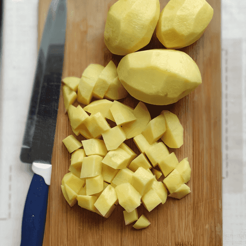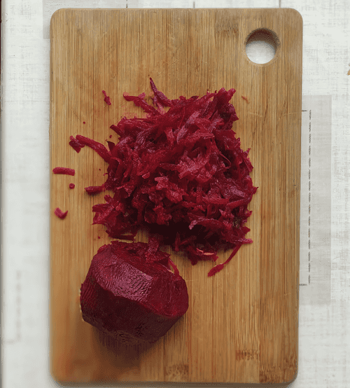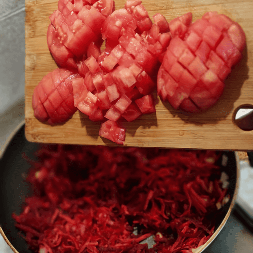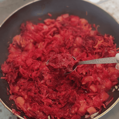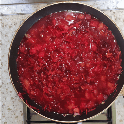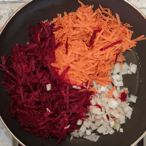 Heat vegetable oil in a pan and add beetroot, carrot, and onion. Fry until golden brown. Meanwhile, add potatoes to the broth.