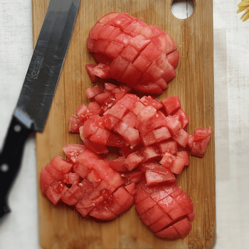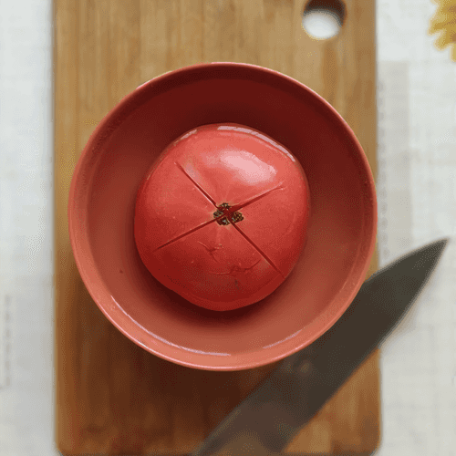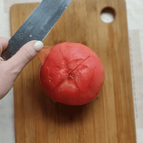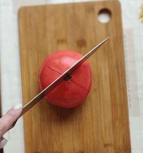 Tomatoes need to be peeled. First, make cross-shaped cuts with a knife.
