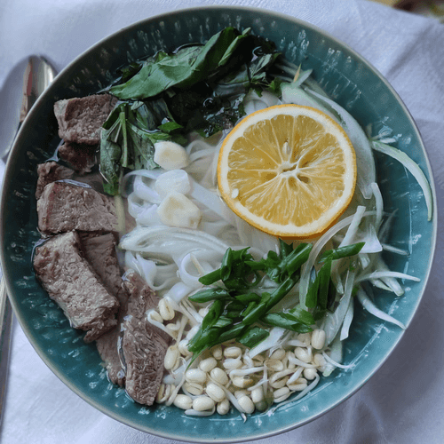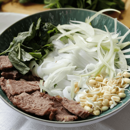 Put noodles, meat, onion, soybean sprouts, and greens in a plate, pour broth over it and drizzle with lemon juice on top.