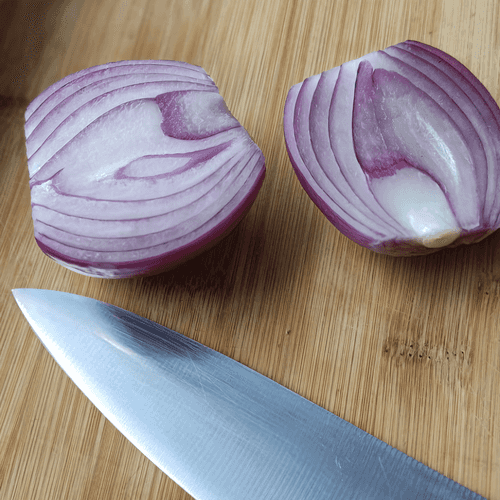Peel the red onion and cut it in half.