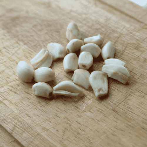 Divide the garlic head into cloves and cut them in half.