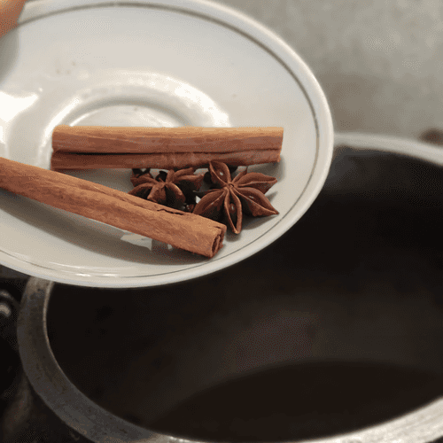 Turn off the broth, remove the cooked meat, onion, and ginger. Then add cinnamon, star anise, and cloves and put it back on the heat.
