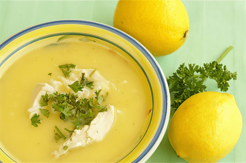Whisk the eggs into a foam, then add the juice of one lemon and 1 tablespoon of cold water. Add a ladle of hot broth to the eggs, mix, then add another 1-2 ladles of broth.