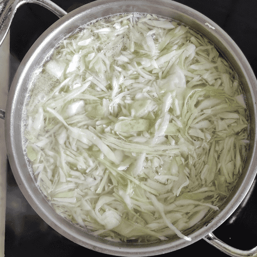 Add cabbage to the boiling broth and cook for 5 minutes. Then add potatoes.